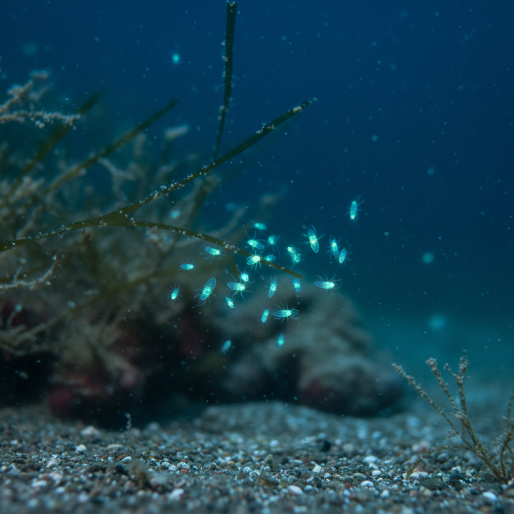 Ostracod crustaceans, often called "sea fireflies" or "blue tears," are microscopic marine organisms that create some of the ocean's most spectacular bioluminescent displays, transforming